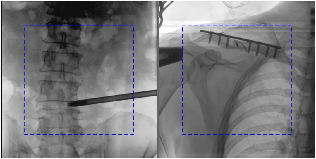 普愛醫(yī)療大平板一體式C形臂圖像與傳統(tǒng)圖像對比(藍色虛線內(nèi)為傳統(tǒng)21CM×21CM平板的成像區(qū)域)