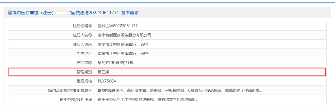 《醫(yī)療器械分類(lèi)目錄》中,“移動(dòng)式C形臂X射線(xiàn)機(jī)”品類(lèi),帶有“數(shù)字化體層攝影“功能的C形臂按III三類(lèi)注冊(cè)證管理,其它用于外科手術(shù)透視及攝影,獲得影像供臨床診斷用的C形臂歸屬II二類(lèi)注冊(cè)證管理。普愛(ài)醫(yī)療平板三維C形臂已取得三類(lèi)醫(yī)療器械注冊(cè)證。